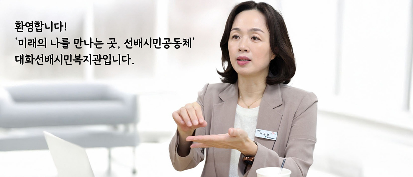 저희 대화노인종합복지관은 선배님이신 어르신의 가치를 존중하고 섬기는 윤리경영 시스템을 기반으로 인간존엄성 가치와 사회복지 전문성을 갖춘 전인적 돌봄 인재를 양성하여 다양한 노년층의 욕구에 따라 맞춤형 노인복지서비스를 개발하고, 지역사회와 소통하고 협력하는 열린 복지 가치를 창출하도록 최선을 다하겠습니다.