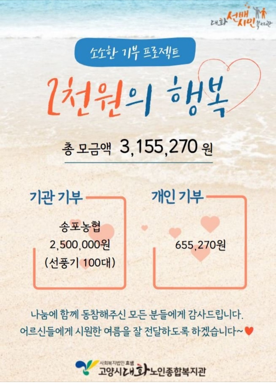 *총 모금액: 3,155,270원- 기관기부: 2,500,000원(송포농협)- 개인기부: 655,270원