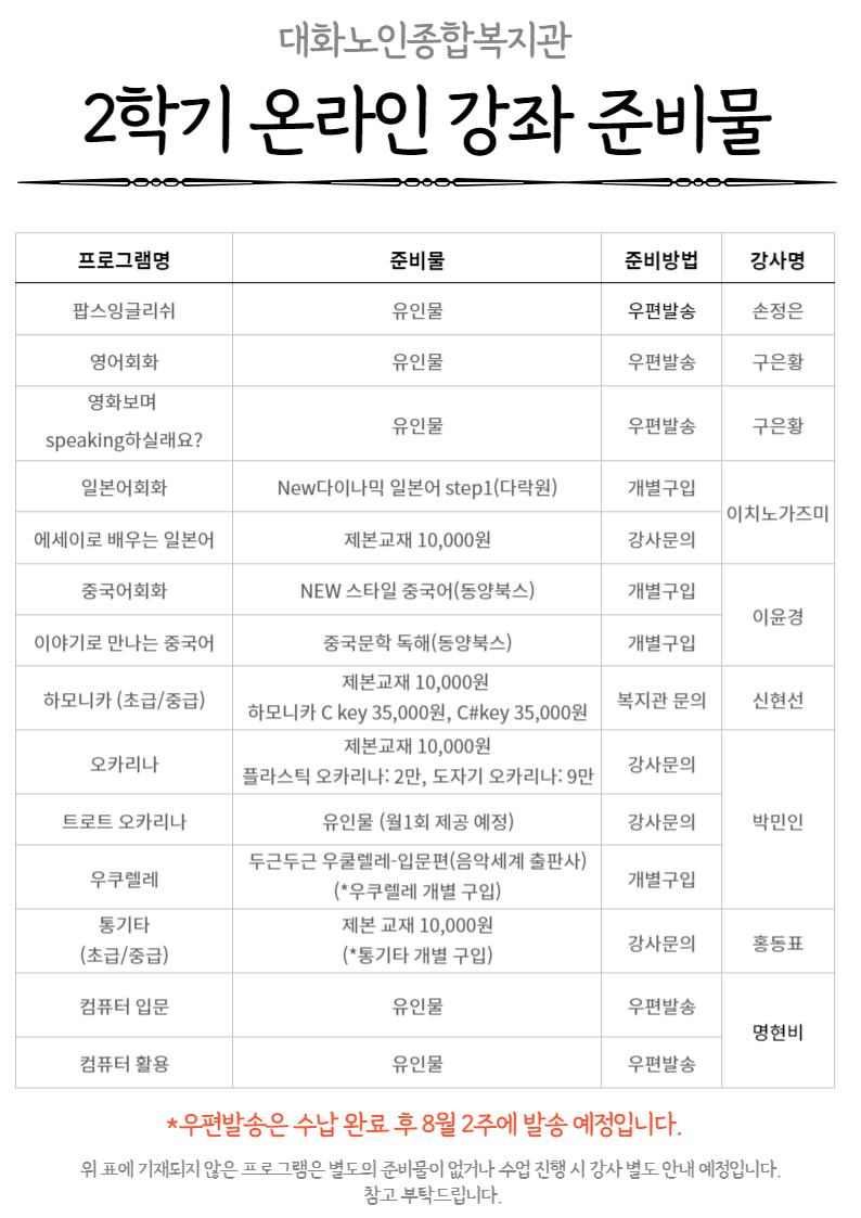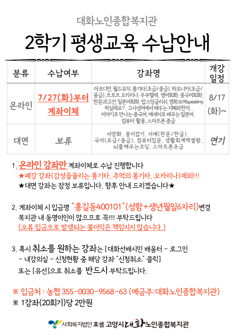 2학기 평생교육 수납 및 대면강좌 연기 안내
