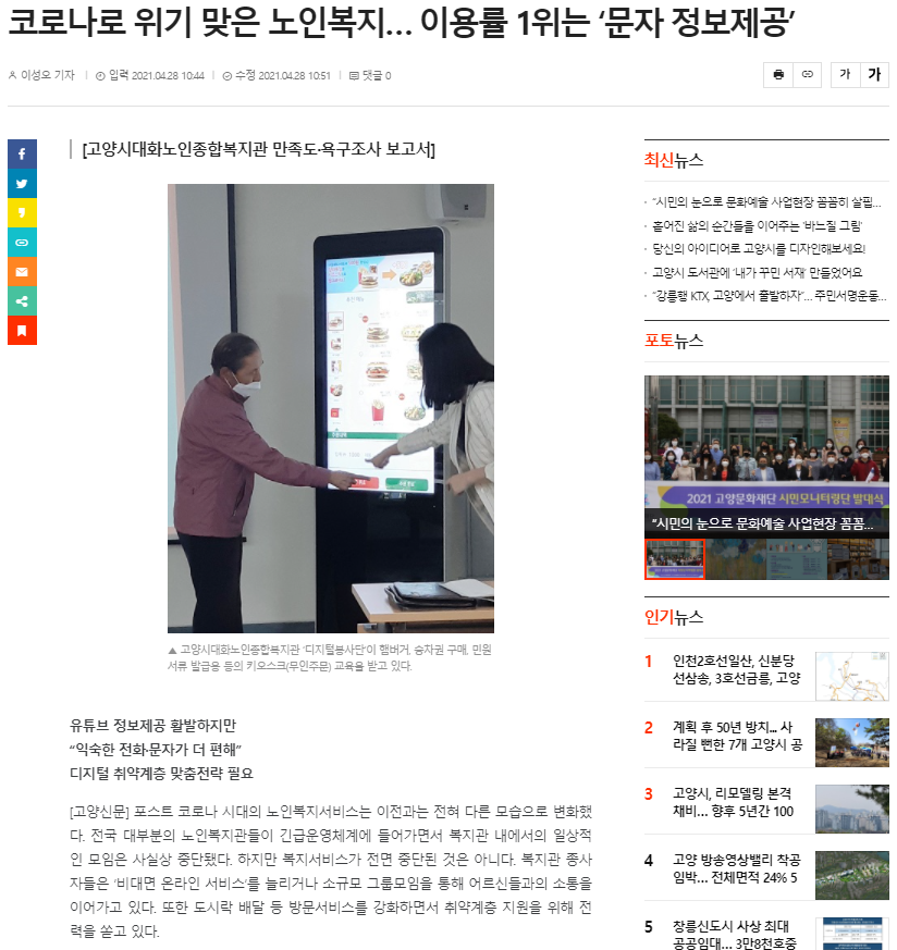 (고양신문) 코로나로 위기 맞은 노인복지...이용률 1위는 '문자 정보제공'