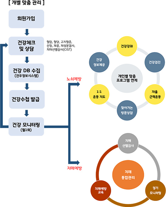 | 치매예방 | 인지선별검사, 치매안심센터 연계, 프로그램 지원(인지, 사회, 영양, 운동, 사회활동), 인지저하 통합관리 |